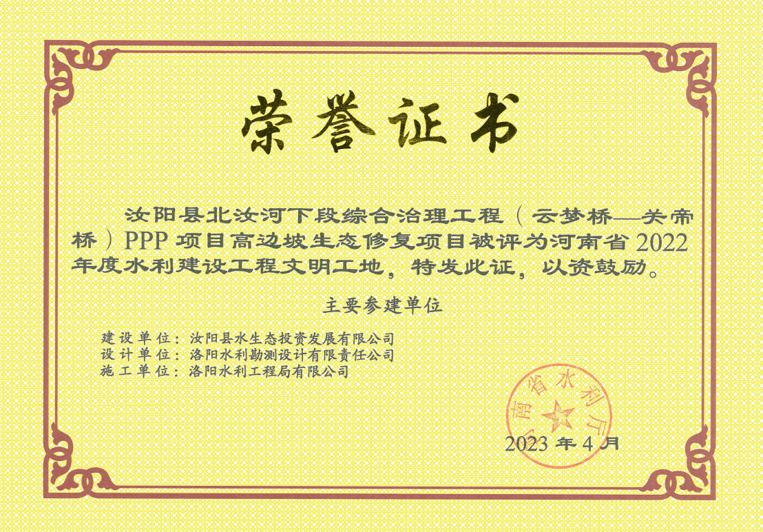 近段時(shí)間以來(lái),公司喜訊連連,先后收到省水利廳、水利學(xué)會(huì)頒發(fā)的多份榮譽(yù)證書和獎(jiǎng)杯。其中,洛寧縣連昌河郭頭村至楊坡段河道生態(tài)治理工程和汝陽(yáng)縣北汝河下段綜合治理工程(云夢(mèng)橋—關(guān)帝橋)PPP項(xiàng)目高邊坡生態(tài)修復(fù)項(xiàng)目2個(gè)項(xiàng)目被河南省水利廳評(píng)為河南省2022年度水利建設(shè)工程文明工地;洛陽(yáng)市洛河?xùn)|湖攔河壩工程喜獲河南省水利工程建設(shè)“紅旗渠杯”首批優(yōu)質(zhì)工程榮譽(yù)稱號(hào)。