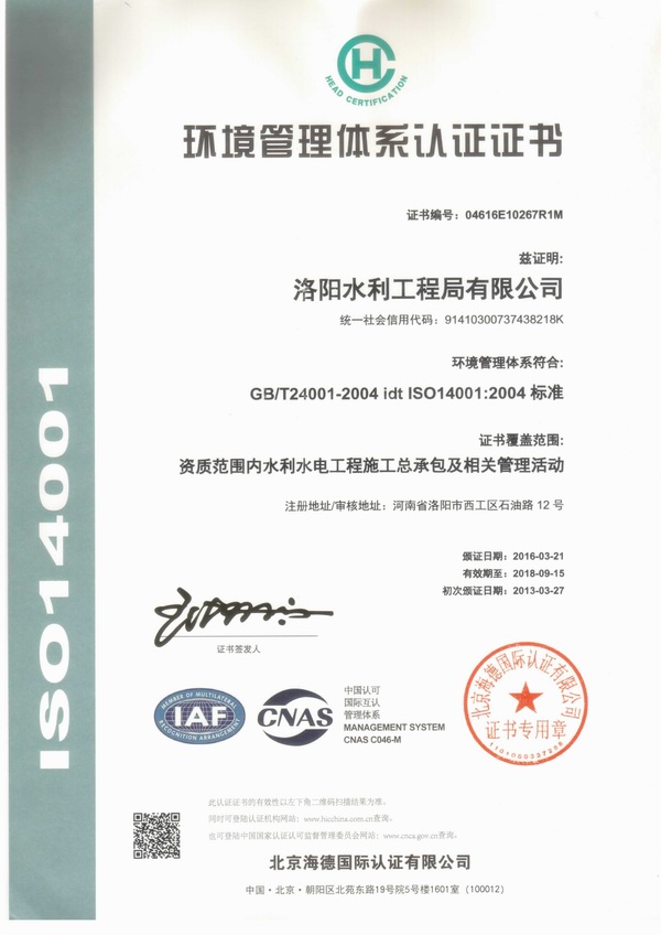 環(huán)境管理體系認證證書