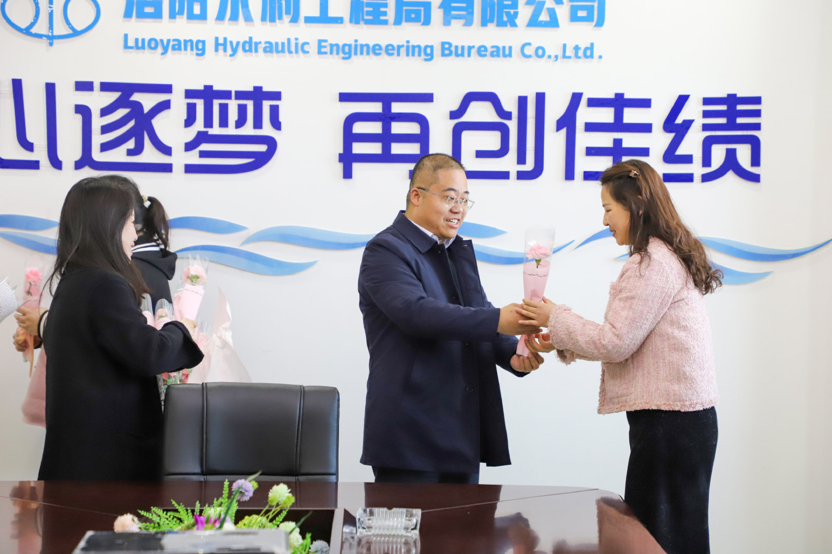 陽(yáng)春三月春意濃,人面桃花相映紅,第114個(gè)“三八”婦女節(jié)如期而至,為充分調(diào)動(dòng)女職工工作積極性、主動(dòng)性和創(chuàng)造性,增強(qiáng)女職工的向心力和凝聚力,3月8日上午,集團(tuán)公司李東坤等領(lǐng)導(dǎo)到中共洛陽(yáng)水利工程局有限公司委員會(huì)(以下簡(jiǎn)稱(chēng)“公司黨委”)為女職工送上鮮花和節(jié)日美好祝福。