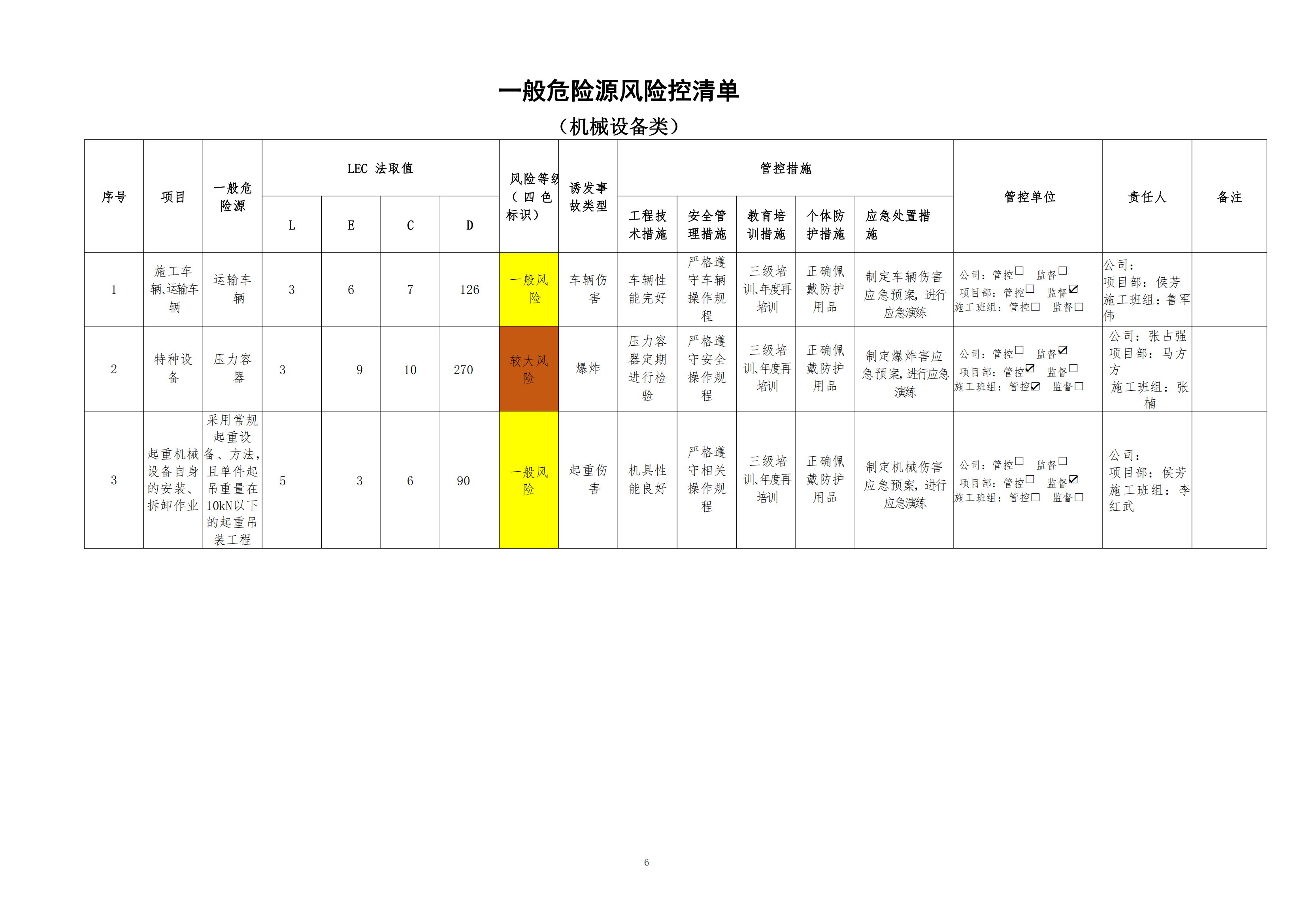 欒川縣新建水庫一期工程施工一標(biāo)段危險源風(fēng)險分級管控清單(4月)